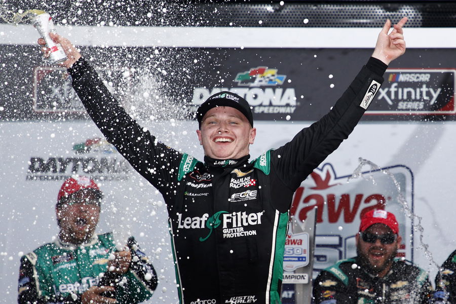 DAYTONA BEACH, FLORIDA – AUGUST 28: Justin Haley, driver of the #11 LeafFilter Gutter Protection Chevrolet, celebrates in the Ruoff Mortgage victory lane after winning the NASCAR Xfinity Series Wawa 250 at Daytona International Speedway on August 28, 2021 in Daytona Beach, Florida. (Photo by Jared C. Tilton/Getty Images)