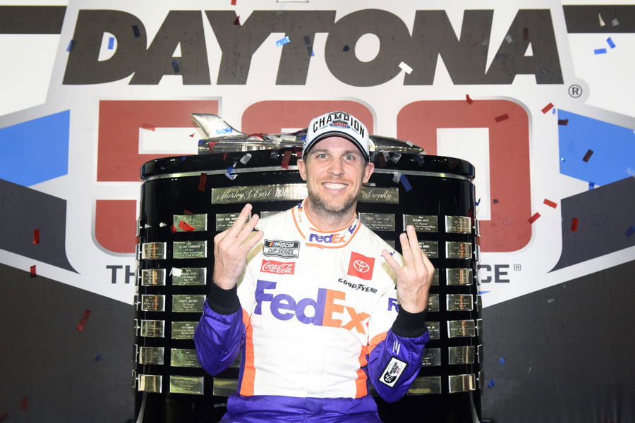 DAYTONA BEACH, FLORIDA – FEBRUARY 17: Denny Hamlin, driver of the #11 FedEx Express Toyota, poses with the trophy in Victory Lane after winning the NASCAR Cup Series 62nd Annual Daytona 500 at Daytona International Speedway in Daytona Beach, Florida. (Photo by Jared C. Tilton/Getty Images)