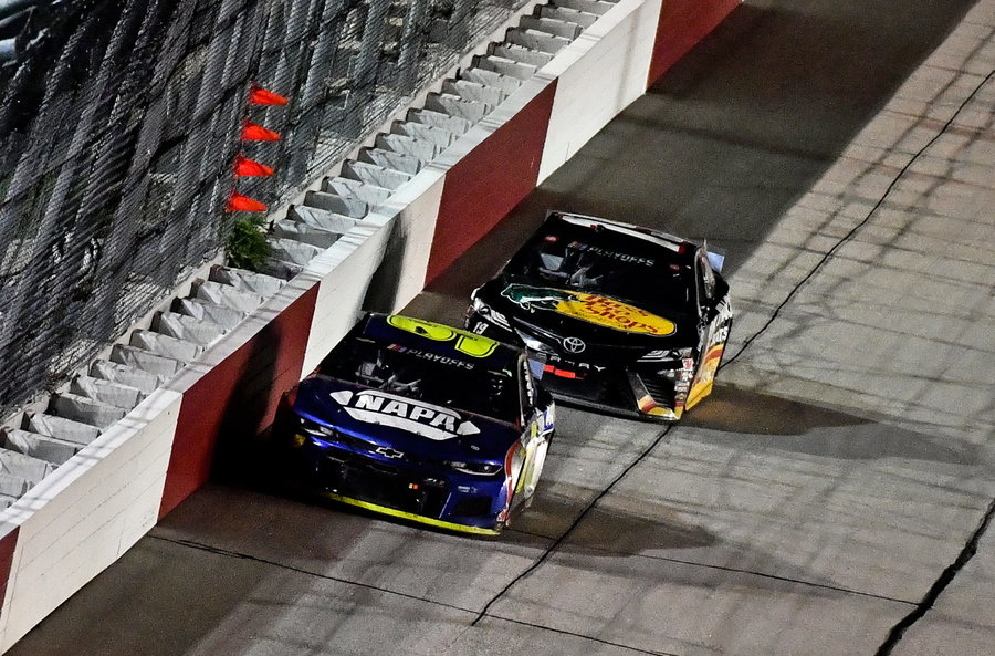 Richmond, Virginia, USA; NASCAR Cup Series driver Martin Truex Jr. (19) races NASCAR Cup Series driver Chase Elliott (9) during the Federated Auto Parts 400 at Richmond International Raceway. Mandatory Credit: Amber Searls-USA TODAY Sports | Reuters
