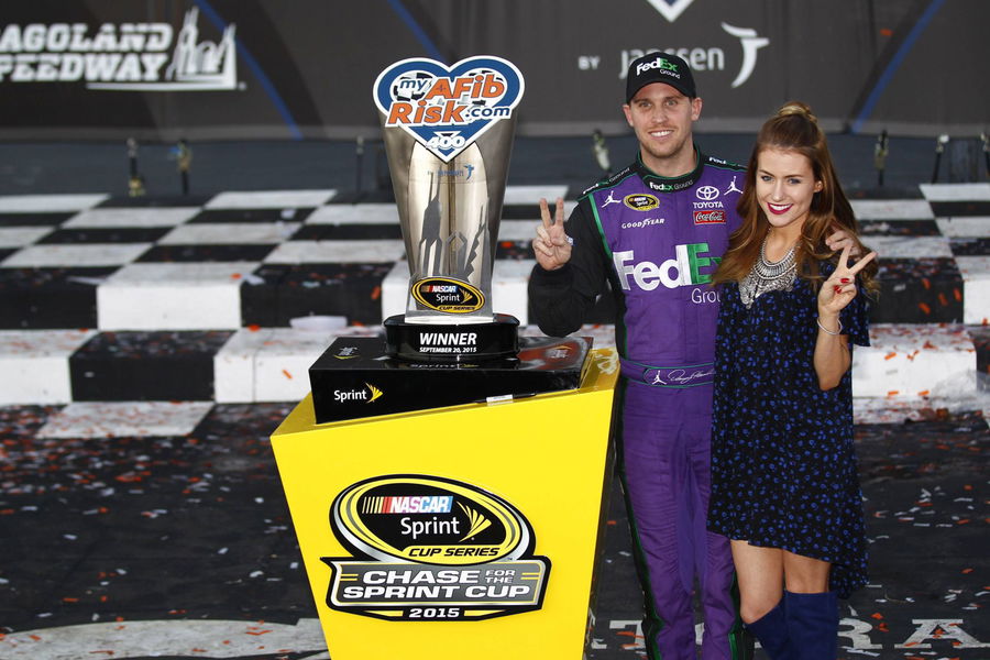 Sept. 20, 2015 – Joliet, IL, U.S. – Joliet, IL – Sep 20, 2015: Denny Hamlin (11) and his girlfriend, Jordan Fish, celebrate after he wins the myAFibRisk.com 400 at Chicagoland Speedway in Joliet, IL. NASCAR Motorsport USA 2015: Sprint Cup Series myAFibRisk.com 400 Sep 20 – ZUMAa55_