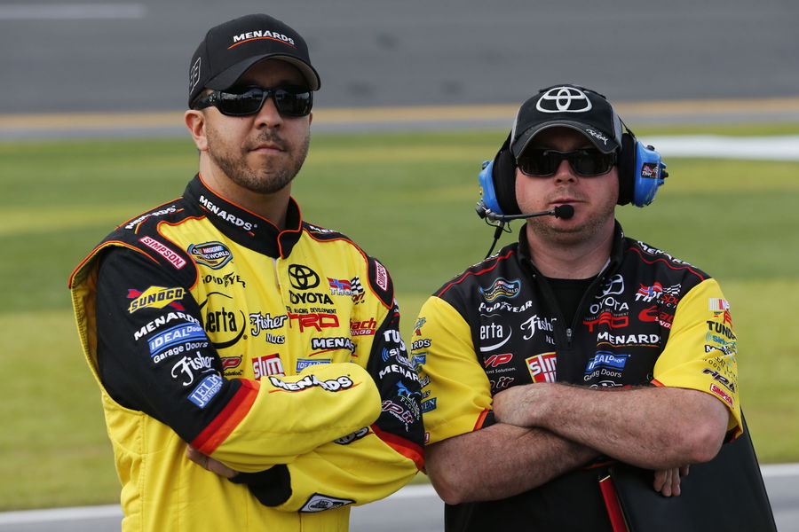DAYTONA BEACH, FL – FEBRUARY 22: Matt Crafton, driver of the #88 Slim Jim/Menards Toyota, stands with crew chief Carl Joiner before qualifying for the NASCAR Camping World Truck Series NextEra Energy Resources 250 at Daytona International Speedway on February 22, 2013 in Daytona Beach, Florida. (Photo by Sam Greenwood/Getty Images)