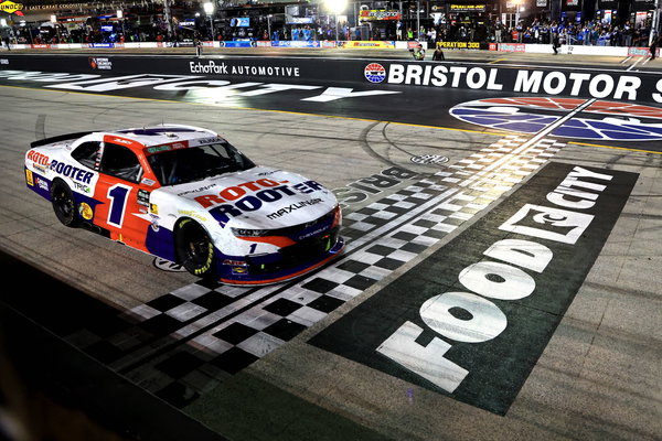 BRISTOL, TN – APRIL 11: Connor Zilisch 1 JR Motorsports Roto-Rooter Chevrolet crosses the finish line after winning the NASCAR, Motorsport, USA O Reilly Auto Parts Series Suburban Propane 300 on April 11, 2026 at Bristol Motor Speedway in Bristol, TN. Photo by Jeff Robinson/Icon Sportswire AUTO: APR 11 NASCAR OReilly Auto Parts Series Suburban Propane 300 EDITORIAL USE ONLY Icon2604113006300