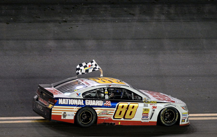 DAYTONA BEACH, FL – FEBRUARY 23: Dale Earnhardt Jr., driver of the #88 National Guard Chevrolet, celebrates with the checkered flag after winning the NASCAR Sprint Cup Series Daytona 500 at Daytona International Speedway in Daytona Beach, Florida. (Photo by Jared C. Tilton/Getty Images)