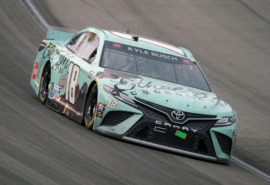Mar 7, 2021; Las Vegas, Nevada, USA; NASCAR Cup Series driver Kyle Busch (18) during the Pennzoil 400 at Las Vegas Motor Speedway. Mandatory Credit: Gary A. Vasquez-USA TODAY Sports