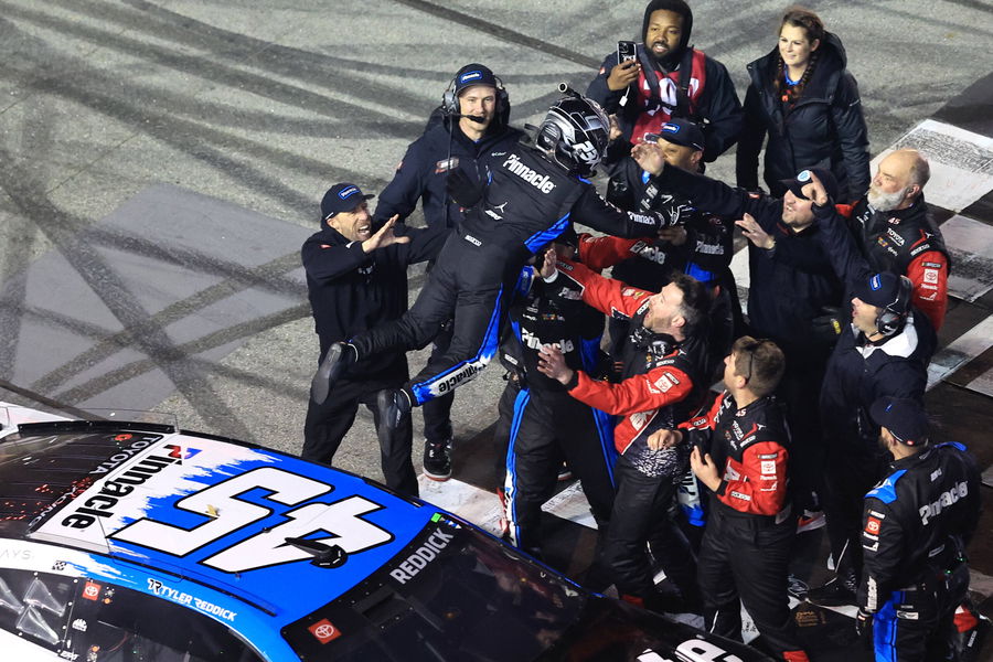 ATLANTA, GA – FEBRUARY 22: Tyler Reddick 45 23XI Racing Pinnacle Toyota celebrates after winning the NASCAR, Motorsport, USA Cup Series Autotrader 400 on February 22, 2026 at EchoPark Speedway in Hampton, GA. Photo by Jeff Robinson/Icon Sportswire AUTO: FEB 22 NASCAR Cup Series Autotrader 400 EDITORIAL USE ONLY Icon26022212771400
