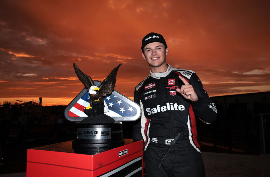 LONG POND, PENNSYLVANIA – JULY 12: Corey Heim, driver of the #11 Safelite Toyota, celebrates in victory lane after winning the NASCAR Craftsman Truck Series CRC Brakleen 175 at Pocono Raceway on July 12, 2024 in Long Pond, Pennsylvania. (Photo by James Gilbert/Getty Images)