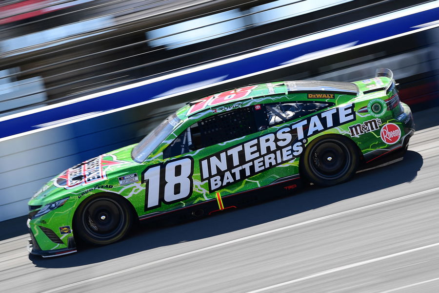 Feb 26, 2022; Fontana, California, USA; NASCAR Cup Series driver Kyle Busch (18) during practice for the WISE Power 400 at Auto Club Speedway. Mandatory Credit: Gary A. Vasquez-USA TODAY Sports