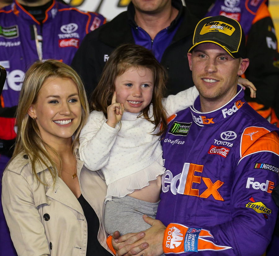 Denny Hamlin, with girlfriend Jordan Fish and their daughter Tammy, celebrate his win in the Can-Am Duel at Daytona 2 on February 23, 2017, in Daytona, Florida.