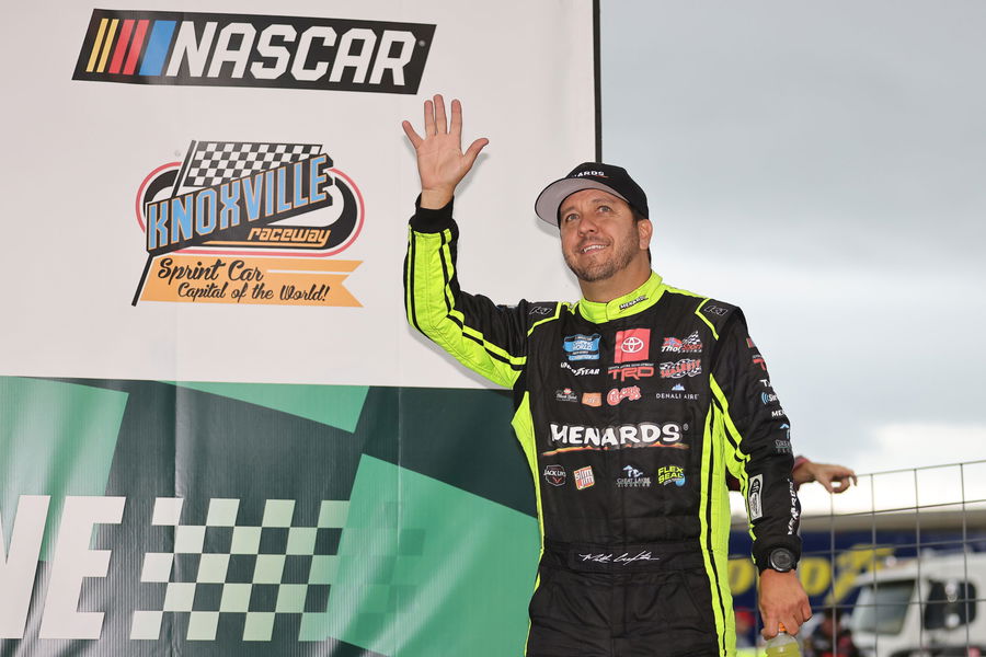 KNOXVILLE, IOWA – JULY 09: Matt Crafton, driver of the #88 Ideal Door/Menards Toyota, waves to fans during driver intros prior to the NASCAR Camping World Truck Series Corn Belt 150 presented by Premier Chevy Dealers at Knoxville Raceway on July 09, 2021 in Knoxville, Iowa. (Photo by James Gilbert/Getty Images)