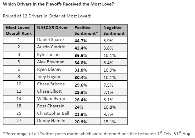 Hendrick Motorsports Chase Elliott ranked 12 in the Most Loved NASCAR Drivers list whereas William Byron made it to the 14th position. With 28.6% and 26.4% of positive sentiment on Twitter, respectively, the two drivers are definitely in the Top 15.