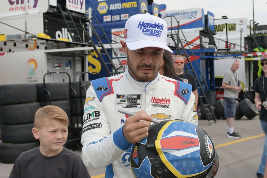NASHVILLE, TN – JUNE 23: Kyle Larson (#5 Hendrick Motorsports HendrickCars.com Chevrolet) signs an autograph during practice for the NASCAR Cup Series Ally 400 on June 23, 2023, at Nashville Superspeedway in Lebanon, TN. (Photo by Jeffrey Vest/Icon Sportswire via Getty Images)