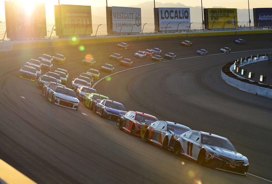 Sep 27, 2020; Las Vegas, Nevada, USA; NASCAR Cup Series driver Denny Hamlin (11) leads driver Alex Bowman (88) and the field during the South Point 400 at Las Vegas Motor Speedway. Mandatory Credit: Gary A. Vasquez-USA TODAY Sports