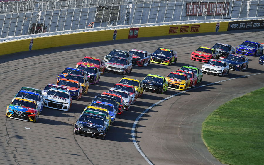 Sep 27, 2020; Las Vegas, Nevada, USA; NASCAR Cup Series driver Kevin Harvick (4) and driver Kyle Busch (18) lead the field for the start of the South Point 400 at Las Vegas Motor Speedway. Mandatory Credit: Gary A. Vasquez-USA TODAY Sports