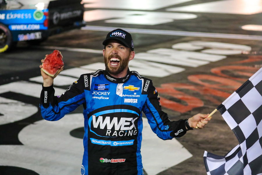 CHARLOTTE, NC – MAY 27: Ross Chastain, driver of the 41 Worldwide Express Chevrolet, celebrates by eating a smashed watermelon after winning the Camping World Truck Series North Carolina Education Lottery 200 on May 27, 2022, at Charlotte Motor Speedway in Charlotte, NC. Photo by David Jensen/Icon Sportswire AUTO: MAY 27 NASCAR, Motorsport, USA Camping World Truck Series North Carolina Education Lottery 200 Icon220527031
