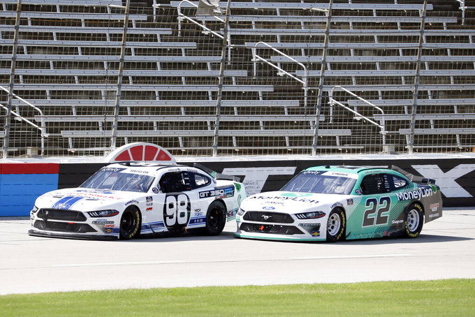 Chase Briscoe (98) and Austin Cindric (22) battle down the front stretch during a NASCAR Xfinity auto race at Texas Motor Speedway in Fort Worth, Texas, Saturday, July 18, 2020. (AP Photo/Ray Carlin)