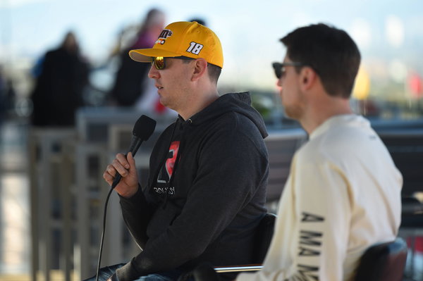 LOS ANGELES, CA – FEBRUARY 05: Kyle Busch 18 Joe Gibbs Racing M&M s Toyota and Denny Hamlin 11 Joe Gibbs Racing FedEx Express Toyota answer questions for a media press conference, PK, Pressekonferenz during the Busch Light Clash at The Coliseum NASCAR, Motorsport, USA Cup Series race on February 05, 2022, at the Los Angeles Memorial Coliseum in Los Angeles, CA. Photo by Chris Williams/Icon Sportswire AUTO: FEB 05 NASCAR Busch Light Clash at The Coliseum Icon0072202050123