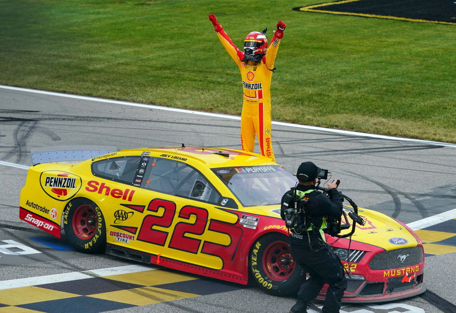 Oct 18, 2020; Kansas City, Kansas, USA; NASCAR Cup Series driver Joey Logano (22) celebrates after winning the Hollywood Casino 400 at Kansas Speedway. Mandatory Credit: Jay Biggerstaff-USA TODAY Sports