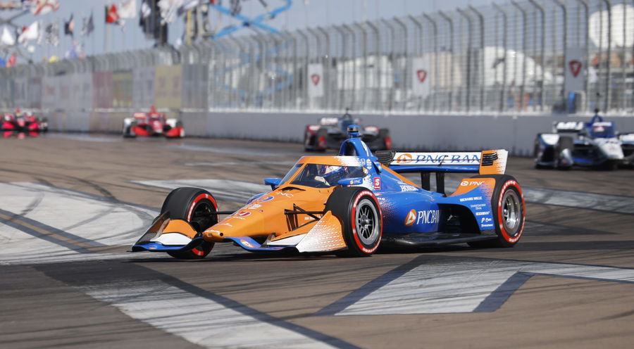 Oct 25, 2020; St. Petersburg, FL, USA; Chip Ganassi Racing driver Scott Dixon (9) of New Zealand enters the first turn during the Firestone Grand Prix race on the Streets of St. Petersburg. Mandatory Credit: Reinhold Matay-USA TODAY Sports