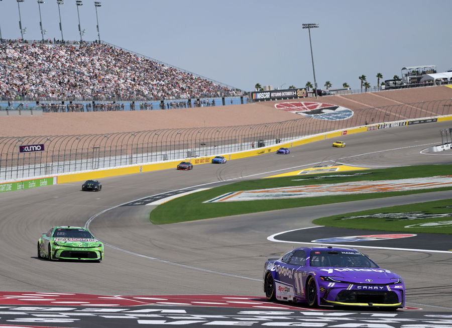 LAS VEGAS, NV – MARCH 15: Denny Hamlin 11 Joe Gibbs Racing Yahoo Toyota leads Christopher Bell 20 Joe Gibbs Racing Interstate Batteries Toyota during the early laps of the NASCAR, Motorsport, USA Cup Series Pennzoil 400 on March 15, 2026, at Las Vegas Motor Speedway in Las Vegas, NV. Photo by Will Lester/Icon Sportswire AUTO: MAR 15 NASCAR Cup Series Pennzoil 400 EDITORIAL USE ONLY Icon24031511851