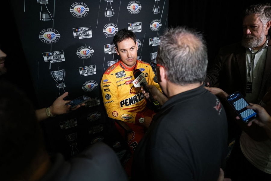 Aug 31, 2023; Charlotte, North Carolina, USA; Joey Logano answers questions from the media at Charlotte Convention Center. Mandatory Credit: Jim Dedmon-USA TODAY Sports