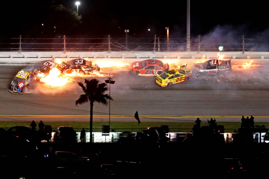 Daytona Beach, Florida, USA; NASCAR Cup Series drivers Brad Keselowski (2), Kyle Busch (18), Joey Logano (22), Brad Keselowski (2) and Austin Cindric (33) wreck during the Daytona 500 at Daytona International Speedway. Mandatory Credit: Mark J. Rebilas-USA TODAY Sports