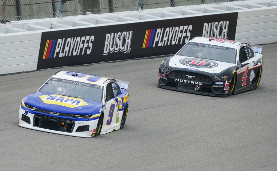 Kansas City, Kansas, USA; NASCAR Cup Series driver Chase Elliott (9) leads Kevin Harvick (4) during the Hollywood Casino 400 at Kansas Speedway. Mandatory Credit: Jay Biggerstaff-USA TODAY Sports