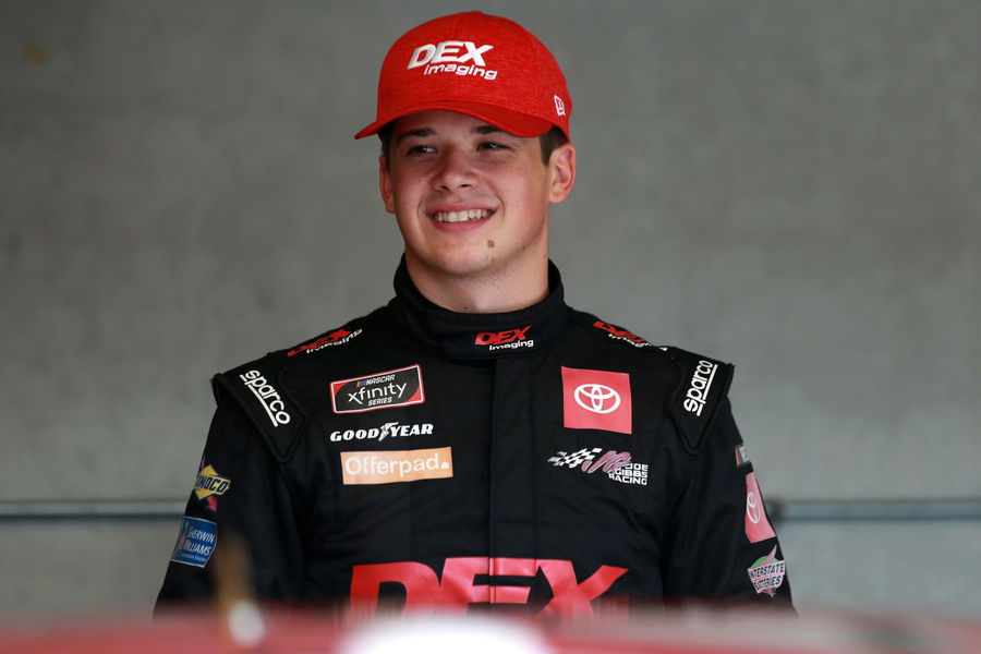 INDIANAPOLIS, Indiana, August 13: Harrison Burton, driver of the #20 DEX Imaging Toyota, waits in the garage area during practice for the NASCAR Xfinity Series Pennzoil 150 at the Brickyard at Indianapolis Motor Speedway on August 13, 2021, in Indianapolis, Indiana. (Photo by Sean Gardner/Getty Images)