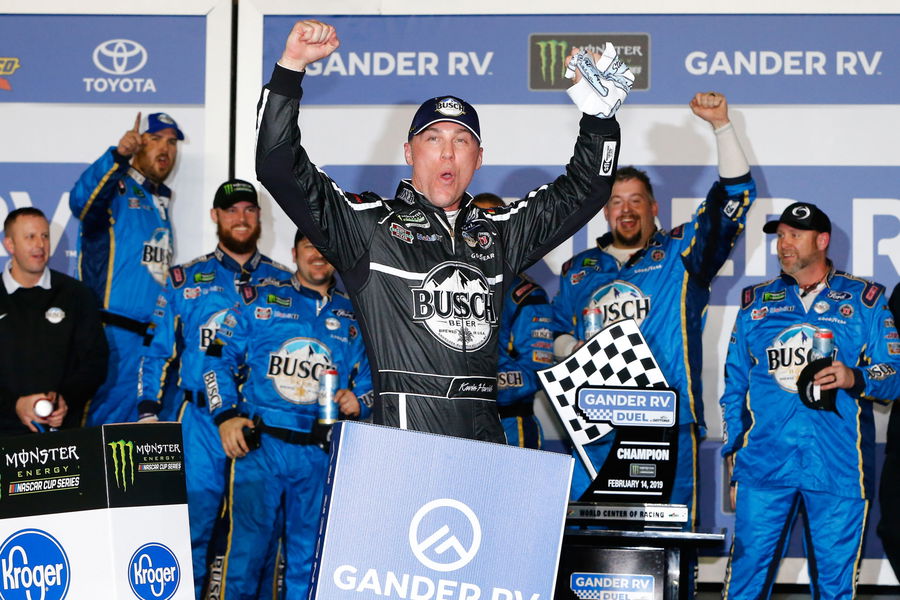 DAYTONA BEACH, FL – FEBRUARY 14: Kevin Harvick, driver of the #4 Busch Beer Car2Can Ford, celebrates in victory lane after winning the Monster Energy NASCAR Cup Series Gander RV Duel At DAYTONA #1 at Daytona International Speedway on February 14, 2019 in Daytona Beach, Florida. (Photo by Jonathan Ferrey/Getty Images)