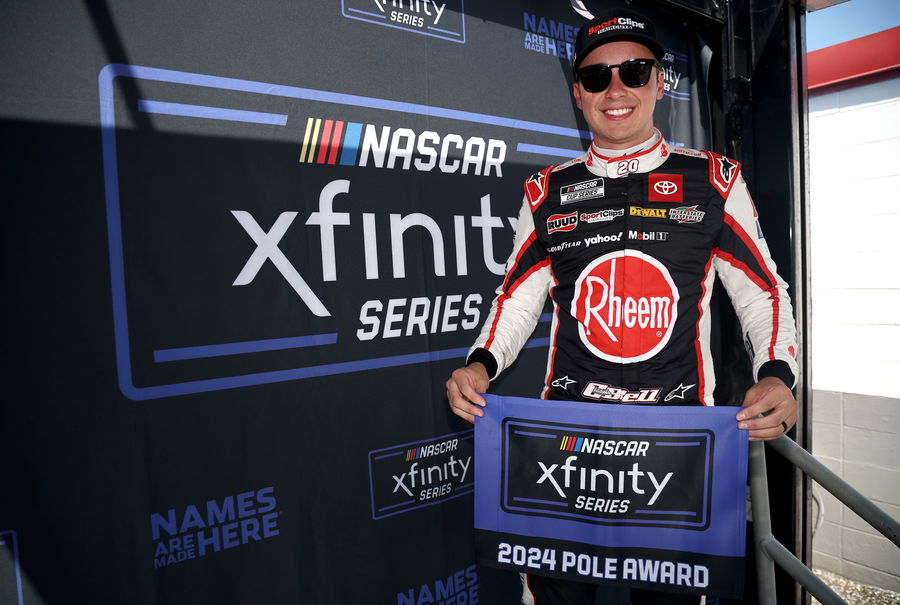DARLINGTON, SOUTH CAROLINA – AUGUST 31: Christopher Bell, driver of the #20 Sport Clips Haircuts Toyota, poses for photos after winning the pole award during qualifying for the NASCAR Xfinity Series Sport Clips Haircuts VFW Help a Hero 200 at Darlington Raceway on August 31, 2024 in Darlington, South Carolina. (Photo by Jared C. Tilton/Getty Images)