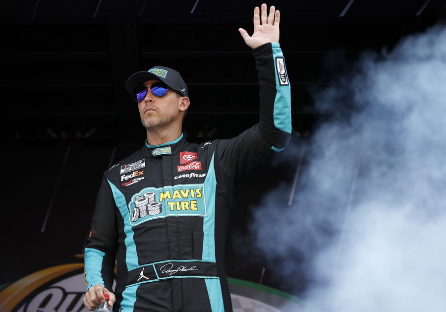 HAMPTON, GEORGIA – SEPTEMBER 08: Denny Hamlin, driver of the #11 Mavis Tire Toyota, waves to fans as he walks onstage during driver intros prior to the NASCAR Cup Series Quaker State 400 Available at Walmart at Atlanta Motor Speedway on September 08, 2024 in Hampton, Georgia. (Photo by Sean Gardner/Getty Images)