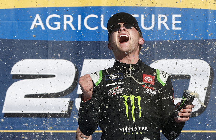 BROOKLYN, MICHIGAN – AUGUST 06: Ty Gibbs, driver of the #54 Monster Energy Toyota, celebrates in victory lane after winning the NASCAR Xfinity Series New Holland 250 at Michigan International Speedway on August 06, 2022 in Brooklyn, Michigan. (Photo by Sean Gardner/Getty Images)