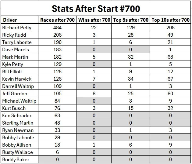 A thread on Reddit shared interesting data that highlighted how the drivers performed after hitting 700 starts in the Cup Series. This list included some of the greats, like Jeff Gordon, Richard Petty, and Rusty Wallace. Interestingly, only Petty managed to get double-digit wins after reaching the milestone. And surprisingly, none of them were able to win their 700th race.