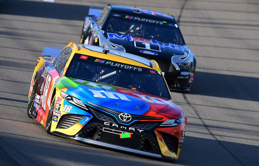 Sep 27, 2020; Las Vegas, Nevada, USA; NASCAR Cup Series driver Kyle Busch (18) leads driver Kevin Harvick (4) during the South Point 400 at Las Vegas Motor Speedway. Mandatory Credit: Gary A. Vasquez-USA TODAY Sports | Reuters