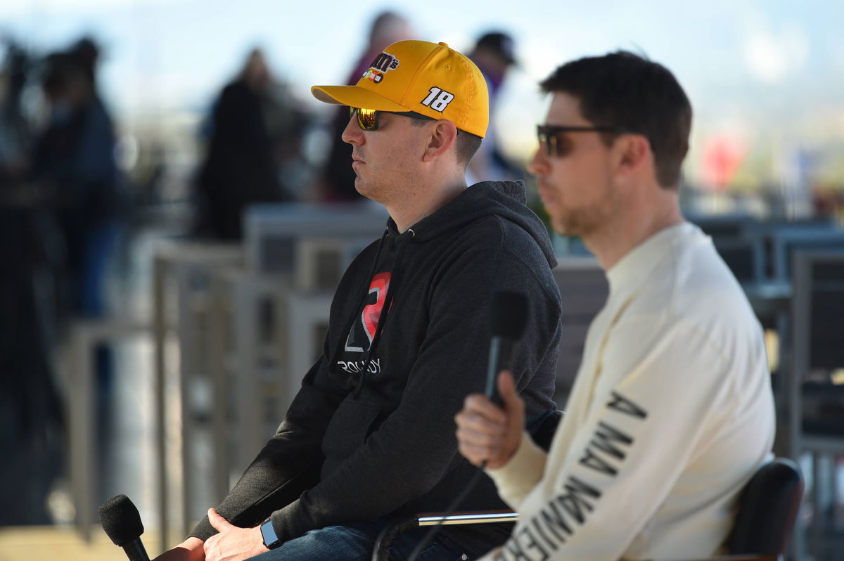 LOS ANGELES, CA – FEBRUARY 05: Kyle Busch 18 Joe Gibbs Racing M&M s Toyota and Denny Hamlin 11 Joe Gibbs Racing FedEx Express Toyota answer questions for a media press conference, PK, Pressekonferenz during the Busch Light Clash at The Coliseum NASCAR, Motorsport, USA Cup Series race on February 05, 2022, at the Los Angeles Memorial Coliseum in Los Angeles, CA. Photo by Chris Williams/Icon Sportswire AUTO: FEB 05 NASCAR Busch Light Clash at The Coliseum Icon0072202050121