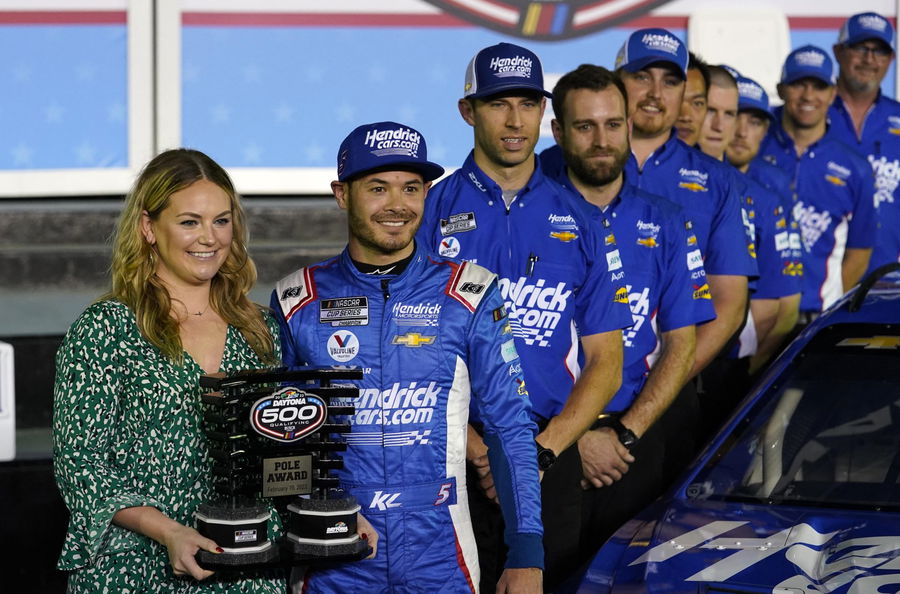 Feb 16, 2022; Daytona, FL, USA; NASCAR Cup Series driver Kyle Larson (5) wins the pole award for the Daytona 500 at Daytona International Speedway. Mandatory Credit: Mike Dinovo-USA TODAY Sports