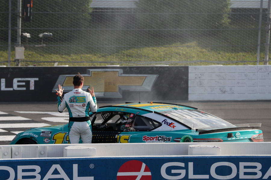 NASCAR, Motorsport, USA HighPoint.com 400 Jul 23, 2023 Long Pond, Pennsylvania, USA NASCAR Cup Series driver Denny Hamlin gestures seven with his fingers for seven career wins at Pocono Raceway after winning the HighPoint.com 400 at Pocono Raceway. Long Pond Pocono Raceway Pennsylvania USA, EDITORIAL USE ONLY PUBLICATIONxINxGERxSUIxAUTxONLY Copyright: xMatthewxO Harenx 20230723_neb_bm2_053