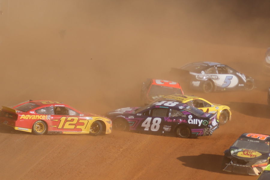 Mar 29, 2021; Bristol, TN, USA; NASCAR Cup Series driver Ryan Blaney (12) and driver Alex Bowman (48) and driver Michael McDowell (34) and driver Austin Dillon (3) are involved in a crash during the Food City Dirt Race at Bristol Motor Speedway. Mandatory Credit: Randy Sartin-USA TODAY Sports