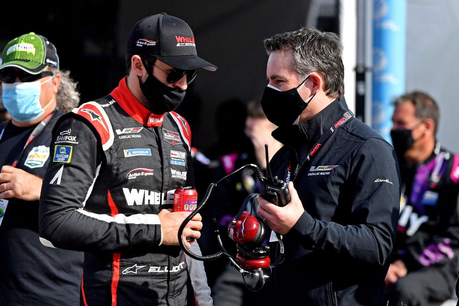 Jan 30, 2021; Daytona Beach, FL, USA; IMSA driver Chase Elliott talks with Fox Sports announcer Jeff Gordon before the Rolex 24 at Daytona International Speedway. Mandatory Credit: Jasen Vinlove-USA TODAY Sports