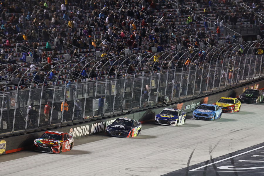 Sep 19, 2020; Bristol, Tennessee, USA; NASCAR Cup Series driver Kyle Busch (18) leads Alex Bowman (88) during the Nascar Bass Pro Shops NRA Night Race at Bristol Motor Speedway. Mandatory Credit: Randy Sartin-USA TODAY Sports