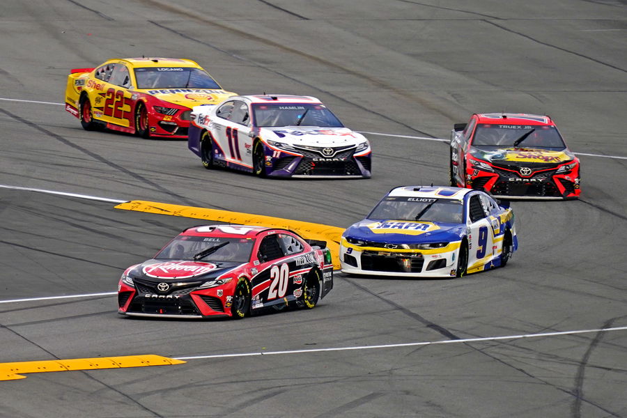 Feb 21, 2021; Daytona Beach, Florida, USA; NASCAR Cup Series driver Christopher Bell (20) leads the field during the O’Reilly Auto Parts 253 at Daytona International Speedway. Mandatory Credit: Jasen Vinlove-USA TODAY Sports