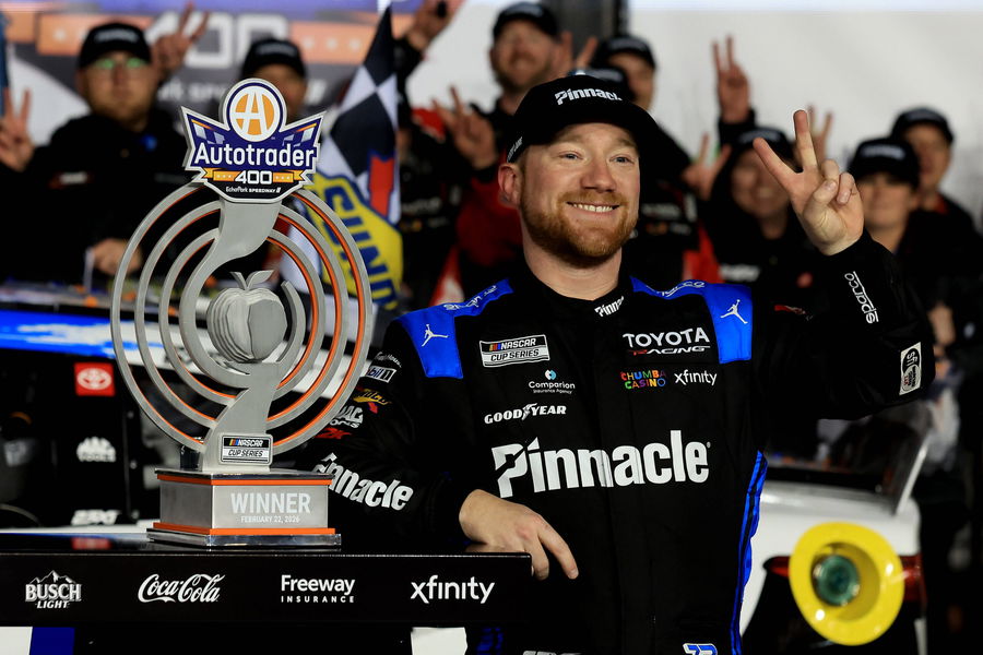 HAMPTON, GA – FEBRUARY 22: Tyler Reddick 45 23XI Racing Pinnacle Toyota celebrates in Victory Lane with the trophy after winning the NASCAR, Motorsport, USA Cup Series Autotrader 400 race on February 22, 2026 at EchoPark Speedway in Hampton, Georgia. Photo by David J. Griffin/Icon Sportswire AUTO: FEB 22 NASCAR Cup Series Autotrader 400 EDITORIAL USE ONLY Icon9532602221499