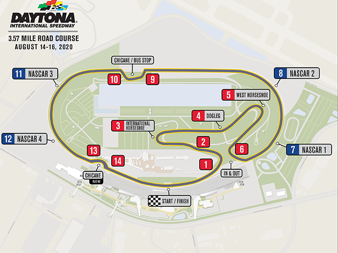 The Road Course has 14-turns. It incorporates a great part of the track’s high-banked four-turn, 2.5-mile oval just as two chicanes and a whale tail-like segment of the infield.
