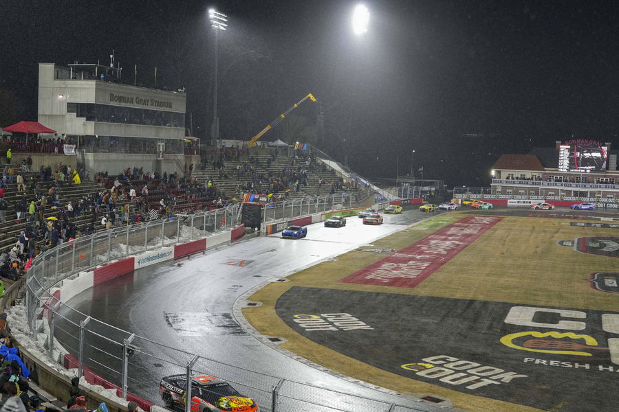 NASCAR, Motorsport, USA Cook Out Clash at Bowman Gray Feb 4, 2026 WInston-Salem, North Carolina, USA Drivers drive around the wet surface after sleet and rain coat the track during the Cook Out Clash at Bowman Gray Stadium. WInston-Salem Bowman Gray Stadium North Carolina USA, EDITORIAL USE ONLY PUBLICATIONxINxGERxSUIxAUTxONLY Copyright: xJimxDedmonx 20260204_jhp_db2_0075