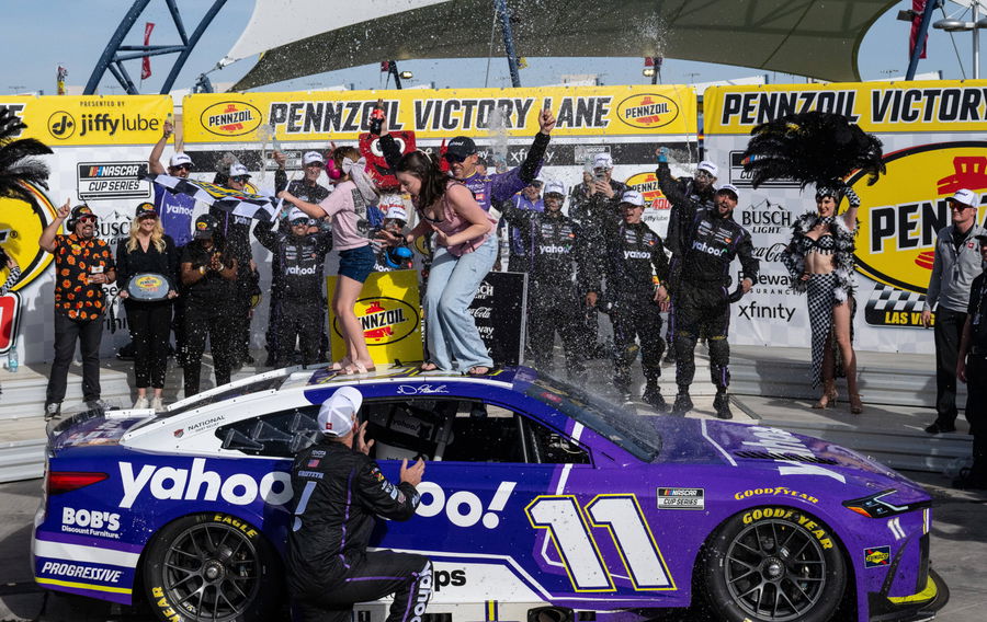 LAS VEGAS, NV – MARCH 15: Denny Hamlin 11 Joe Gibbs Racing Yahoo Toyota celebrates in victory lane as his daughters stand on the car after winning the NASCAR, Motorsport, USA Cup Series Pennzoil 400 on March 15, 2026, at Las Vegas Motor Speedway in Las Vegas, NV. Photo by Will Lester/Icon Sportswire AUTO: MAR 15 NASCAR Cup Series Pennzoil 400 EDITORIAL USE ONLY Icon240315158481