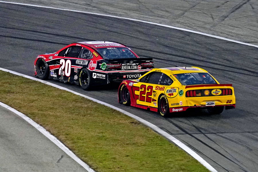 Feb 21, 2021; Daytona Beach, Florida, USA; NASCAR Cup Series driver Christopher Bell (20) leads NASCAR Cup Series driver Joey Logano (22) during the O’Reilly Auto Parts 253 at Daytona International Speedway. Mandatory Credit: Jasen Vinlove-USA TODAY Sports
