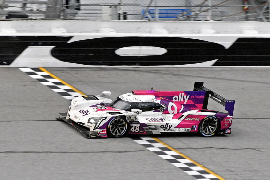 Jan 30, 2021; Daytona Beach, FL, USA; IMSA Series driving team of Jimmie Johnson, Kamui Kobayashi, Simon Pagenaud and Mike Rockenfeller (48) crosses the start finish line during the Rolex 24 at Daytona International Speedway. Mandatory Credit: Jasen Vinlove-USA TODAY Sports