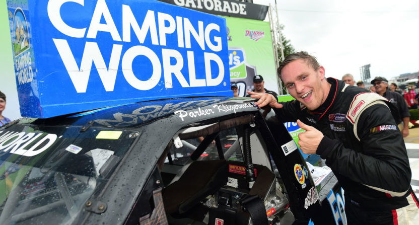 TALLADEGA, AL – OCTOBER 14: Parker Kligerman, driver of the #75 Food Country USA/Lopez Wealth Mgmt Toyota, poses with the winner’s decal on his truck in Victory Lane after winning the NASCAR Camping World Truck Series Fred’s 250 at Talladega Superspeedway on October 14, 2017 in Talladega, Alabama. (Photo by Jared C. Tilton/Getty Images)