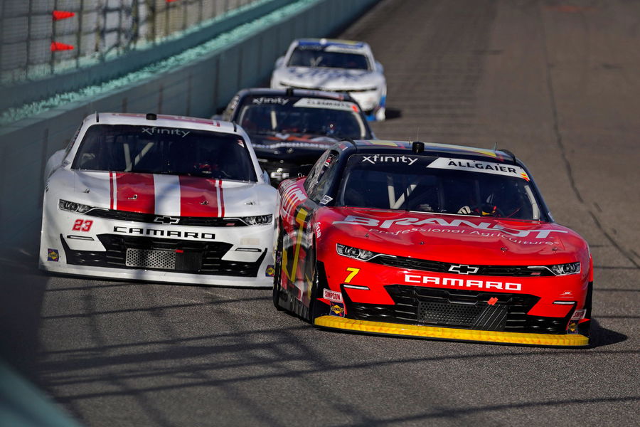 Feb 27, 2021; Miami, FL, USA; NASCAR Xfinity Series driver Justin Allgaier (7) races ahead of Tyler Reddick (23) during the Contender Boats 250 at Homestead-Miami Speedway. Mandatory Credit: Jasen Vinlove-USA TODAY Sports