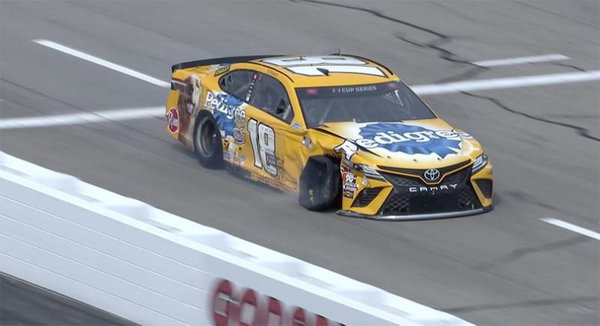 Kyle Busch’s car was seen to have suffered heavy damage on the right side, and the tire seemed destroyed.