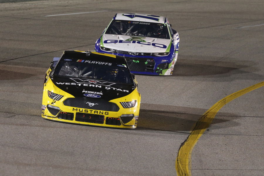 Sep 12, 2020; Richmond, Virginia, USA; NASCAR Cup Series driver Brad Keselowski (2) races NASCAR Cup Series driver Ty Dillon (13) during the Federated Auto Parts 400 at Richmond International Raceway. Mandatory Credit: Amber Searls-USA TODAY Sports